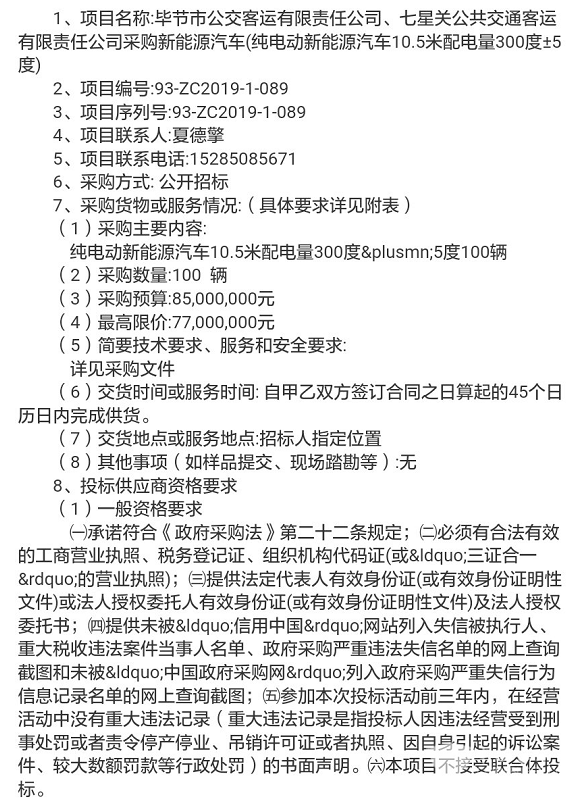 贵州省毕节市公交客运公司、七星关公交客运公司新能源汽车采购公告