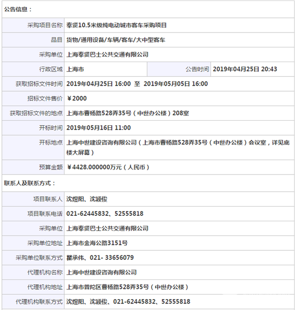 上海奉贤巴士公交公司奉贤10.5米级纯电动城市客车采购项目公开招标公告