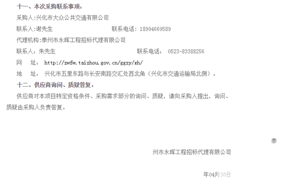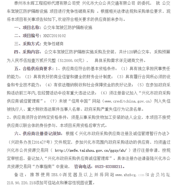 江苏省兴化市大众公交公司公交车驾驶区防护隔离设施项目采购公告
