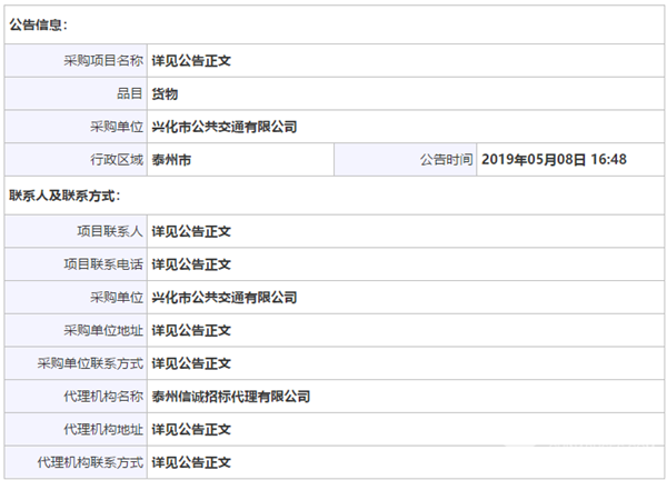 江苏省泰州市兴化市公共交通有限公司纯电动城市公交车项目的采购公告
