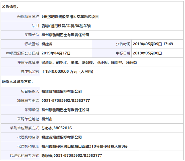福州康驰新巴士有限责任公司6米级地铁接驳专用公交车采购项目中标候选人