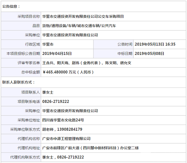 四川省华蓥市交通投资开发有限责任公司公交车采购项目中标公告