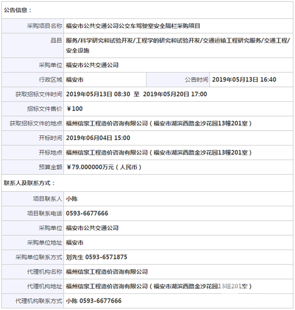 福建省福安市公共交通公司公交车驾驶室安全隔栏采购项目公开招标公告