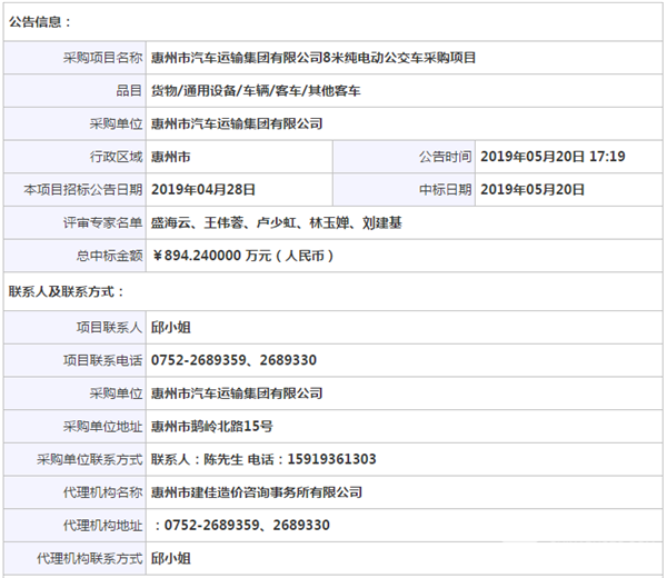 广东省惠州市汽车运输集团有限公司8米纯电动公交车采购项目中标公告