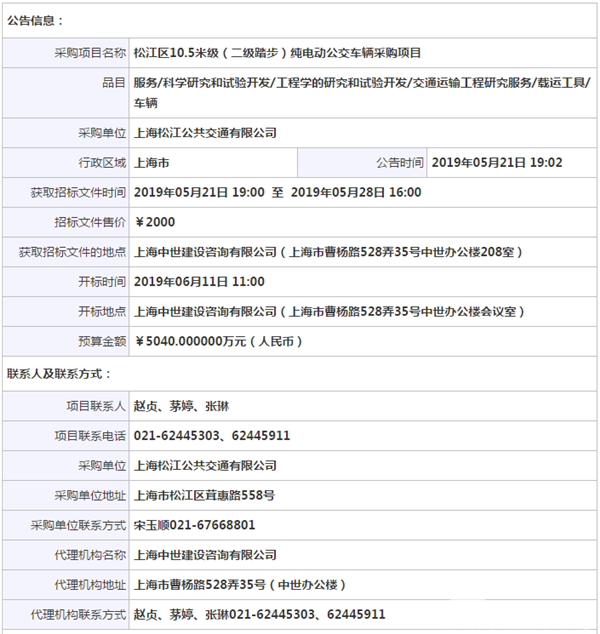 上海市松江区10.5米级(二级踏步)纯电动公交车辆采购项目招标公告