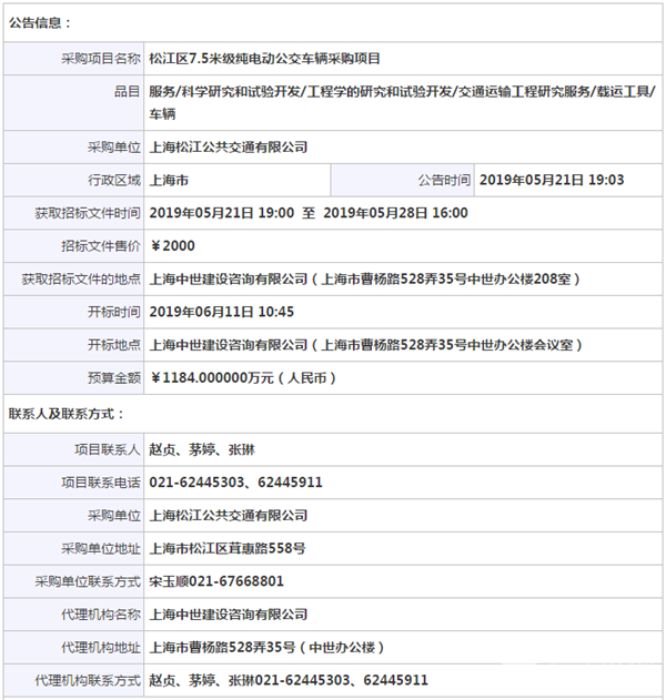 上海市松江区7.5米级纯电动公交车辆采购项目招标公告