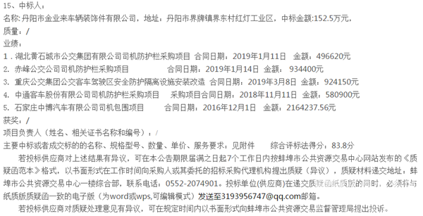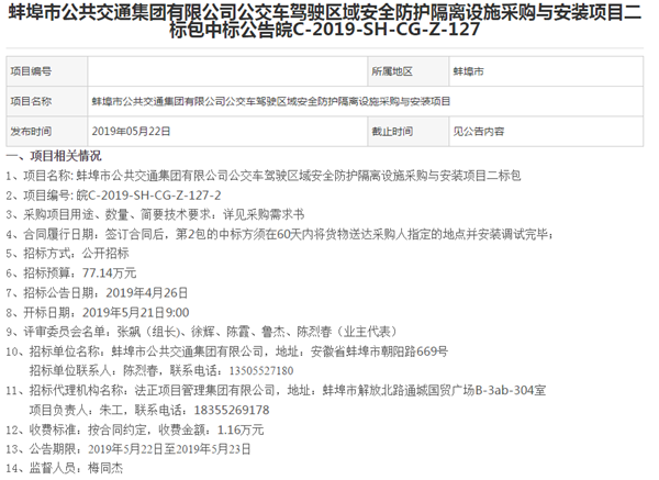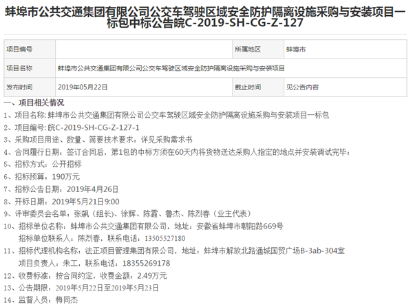 安徽蚌埠公交公司公交车驾驶区安全防护隔离设施采购与安装项目中标公告