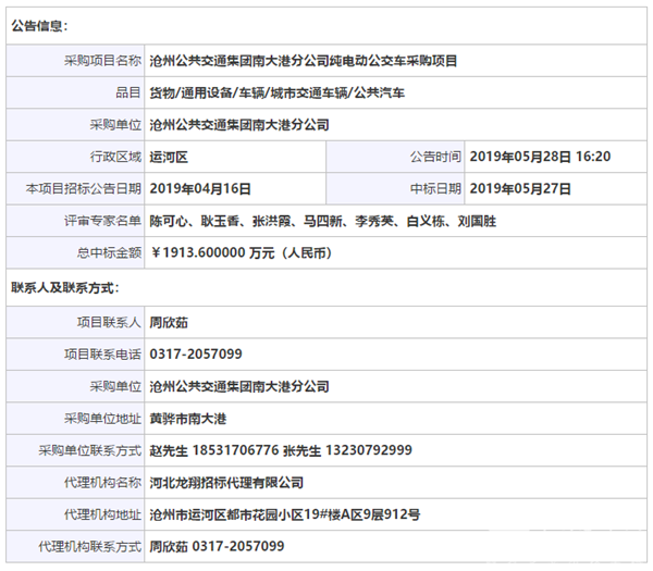 河北沧州公交集团南大港分公司纯电动公交车采购项目(二次)中标公告