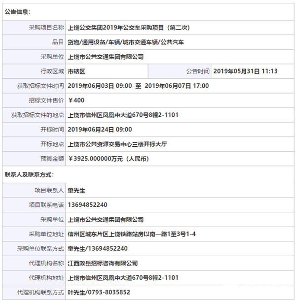 江西省上饶市公交集团2019年公交车采购项目(第二次)公开招标公告