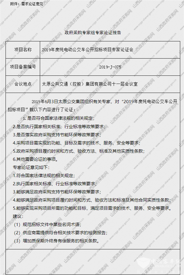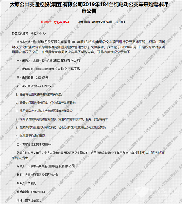 山西太原公交公司2019年184量纯电动公交车采购需求评审公告