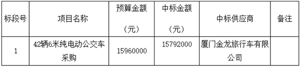 浙江省温州交运集团42辆6米纯电动公交车采购项目的结果公示