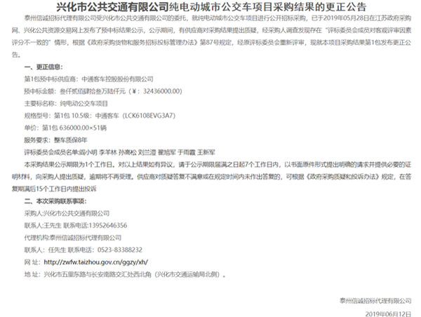 - 兴城市11米 客运版纯电动公交车中标候选人公示