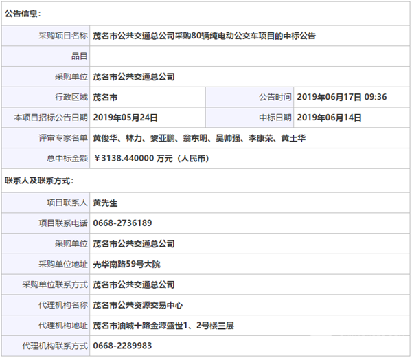 广东省茂名市公交总公司80辆纯电动公交车采购项目中标公告
