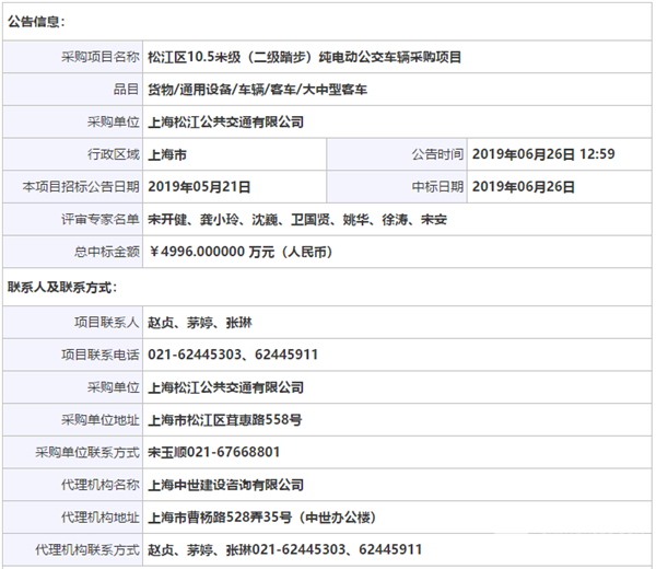 上海松江公交公司松江区10.5米级纯电动公交车辆采购项目中标结果公告
