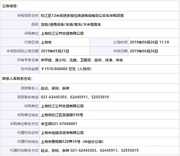上海松江公交公司松江区12米高速多座位旅游版纯电动公交车采购中标公告