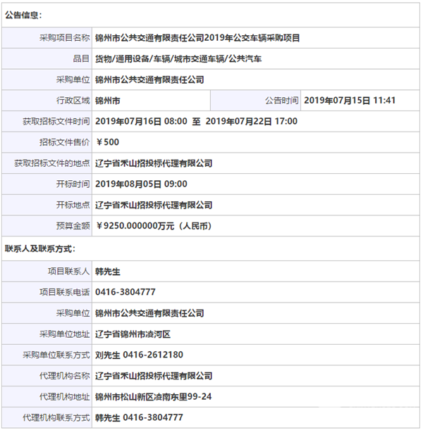 辽宁省锦州市公交公司2019年公交车辆采购项目公开招标公告