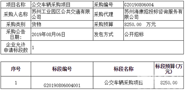 标题:苏州工业园区公共交通有限公司关于公交车辆采购项目G20190806004的采购公告。