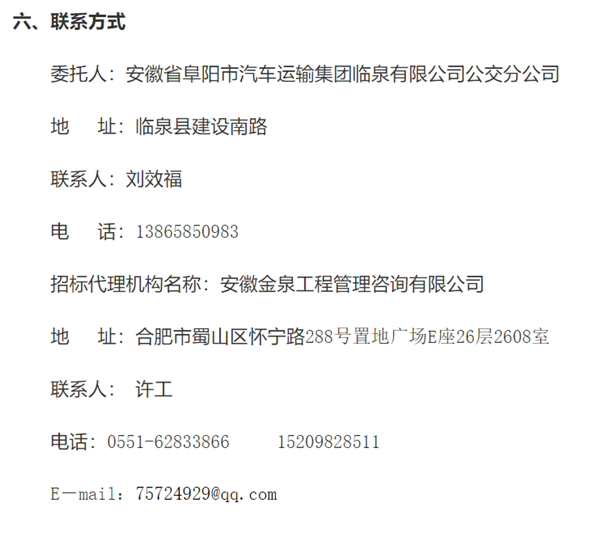 安徽省阜阳市汽车运输集团临泉有限公司公交分公司纯电动公交车招标公告
