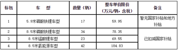 (1)整车单价限价为扣减国家政府对新能源汽车的财政购车补贴后(5.9米磷酸铁锂车型除外)、包含车辆运费等相关费用的整车总价的最高限价;