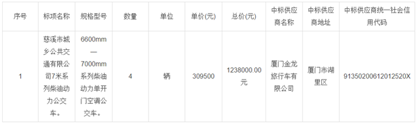浙江省慈溪市城乡公交公司7米系列柴油动力公交车项目中标公告