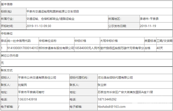 河北省平泉市交通运输局购置新能源公交车项目中标公告