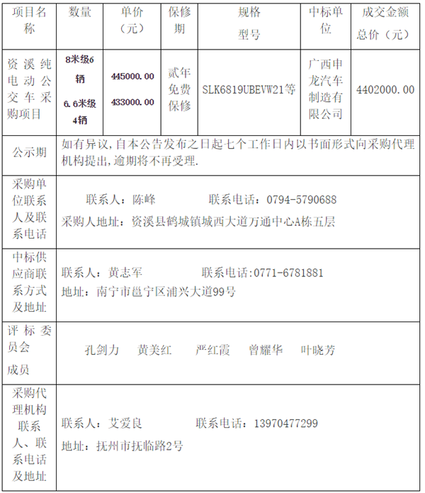 江西省抚州市资溪县纯电动公交车采购项目中标公示