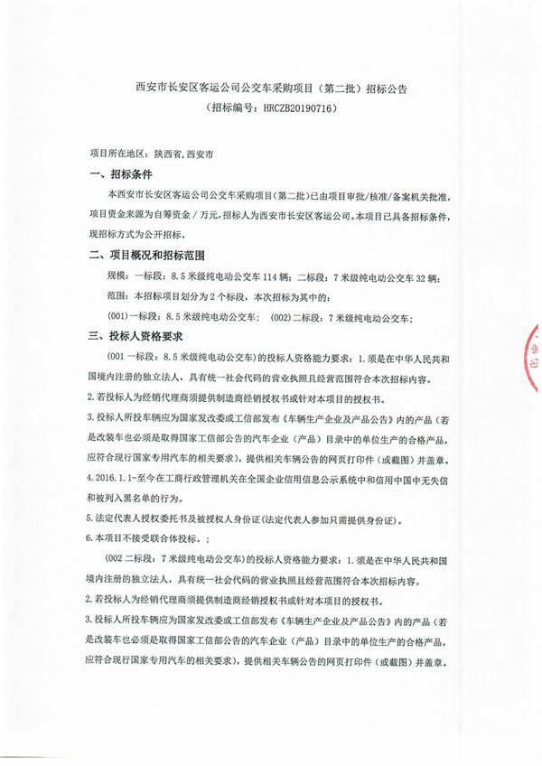陕西省西安市长安区客运公司公交车采购项目(第二批)招标公告