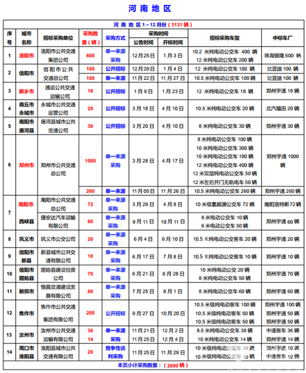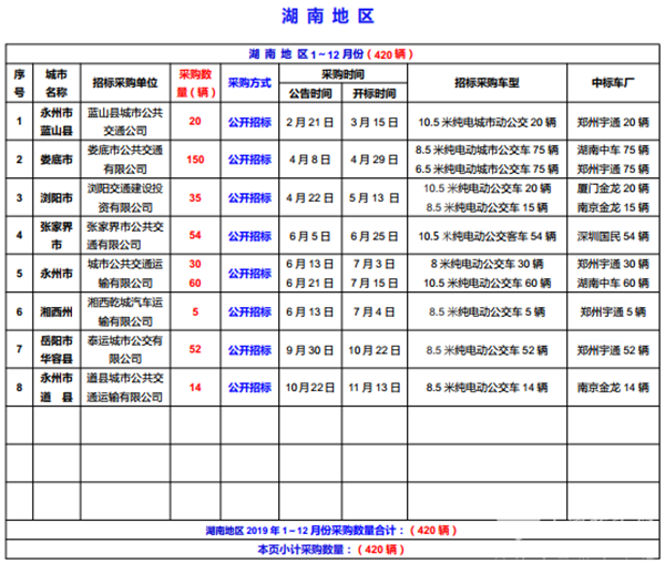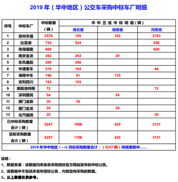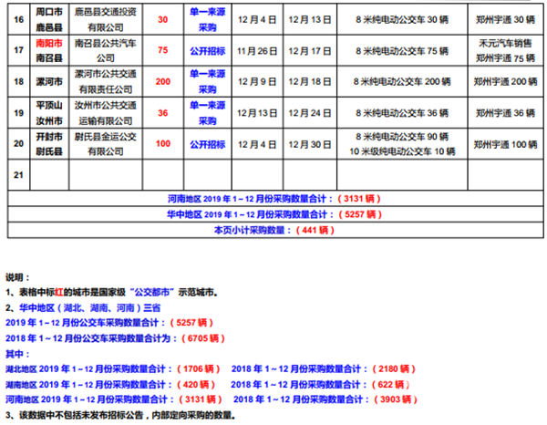 2019年(华中地区)城市公交车采购招标信息表