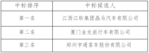 江西省机电设备招标有限公司受赣州市畅兴公共交通有限责任公司的委托,对赣州市畅兴公共交通有限责任公司采购小型柴油公交车项目进行公开招标,开标大会于2020年1月20日在江西省机电设备招标有限公司赣州分公司开标室举行,经评标委员会按招标文件评定,招标人确认,以下单位为中标候选单位: