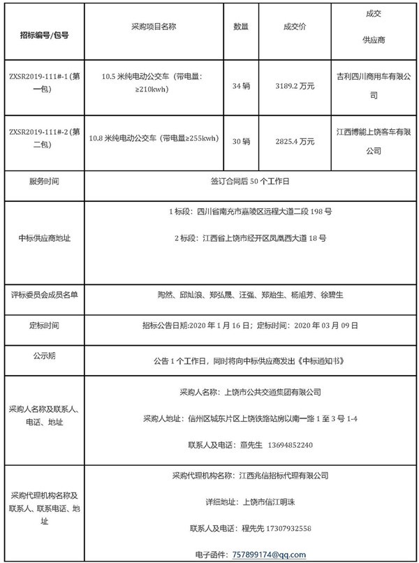 江西兆信招标代理有限公司受上饶市公共交通集团有限公司的委托,就“上饶公交集团2019年公交车采购项目第三批”项目(项目编号:ZXSR2019-111)组织采购,评标工作已经结束,中标结果如下: