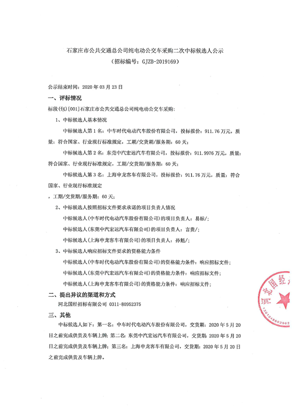河北省石家庄市公共交通总公司纯电动公交车采购二次中标候选人公示