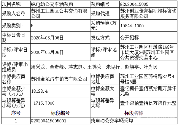 苏州工业园区公共交通有限公司纯电动公交车辆采购中标公告