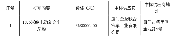 浙江省乐清公交客运有限公司10.5米纯电动公交车采购中标结果公告