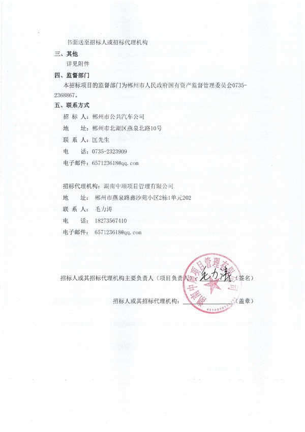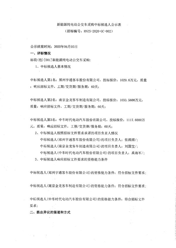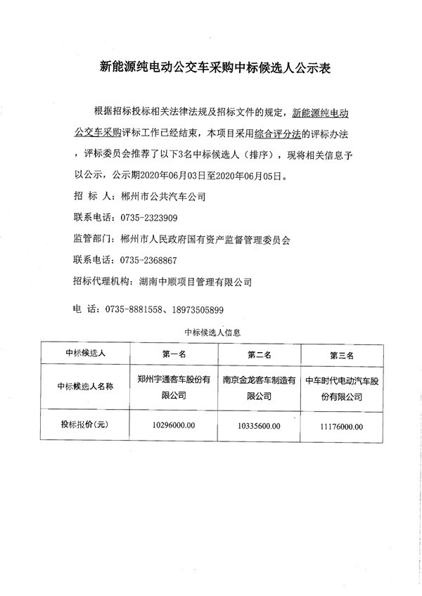湖南省郴州市公共汽车公司新能源纯电动公交车采购中标候选人公示