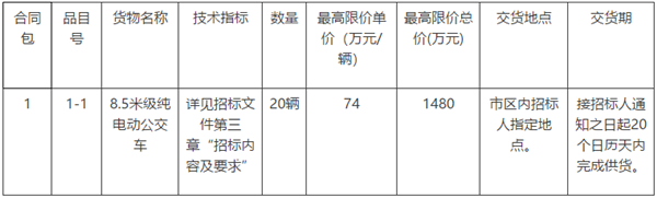 8.5米级纯电动公交车采购项目 招标项目的潜在投标人应在福建省翔晖招标有限公司【福州市鼓楼区乌山西路318号鼓楼科技大厦9层】获取招标文件,并于2020年07月29日 09点00分(北京时间)前递交投标文件。