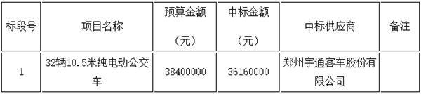 浙江温州交运集团汽车服务有限公司32辆纯电动公交车项目采购结果公示
