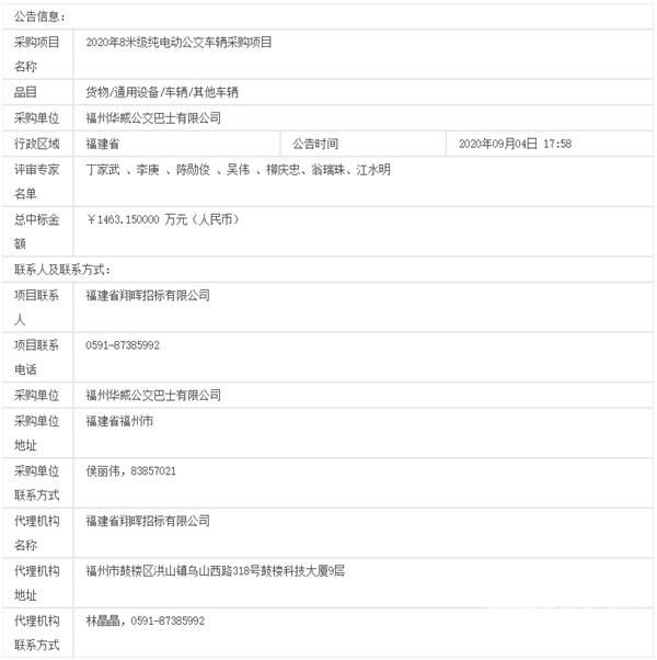 福建省福州市华威公交公司2020年8米级纯电动公交车采购项目招标公告