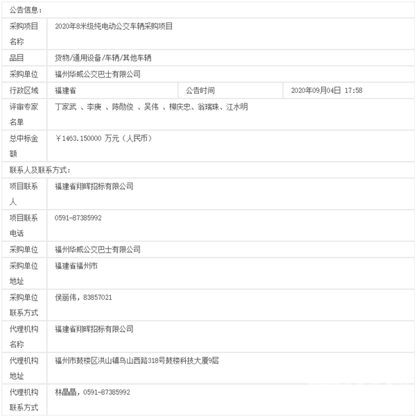 福建省福州市华威公交公司2020年8米级纯电动公交车辆采购项目招标公告