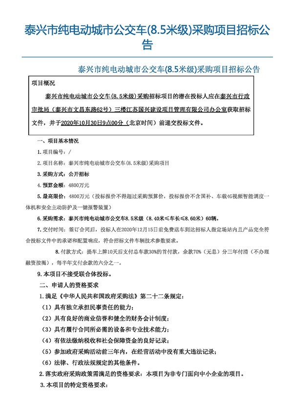 - 兴城市11米 客运版纯电动公交车中标候选人公示