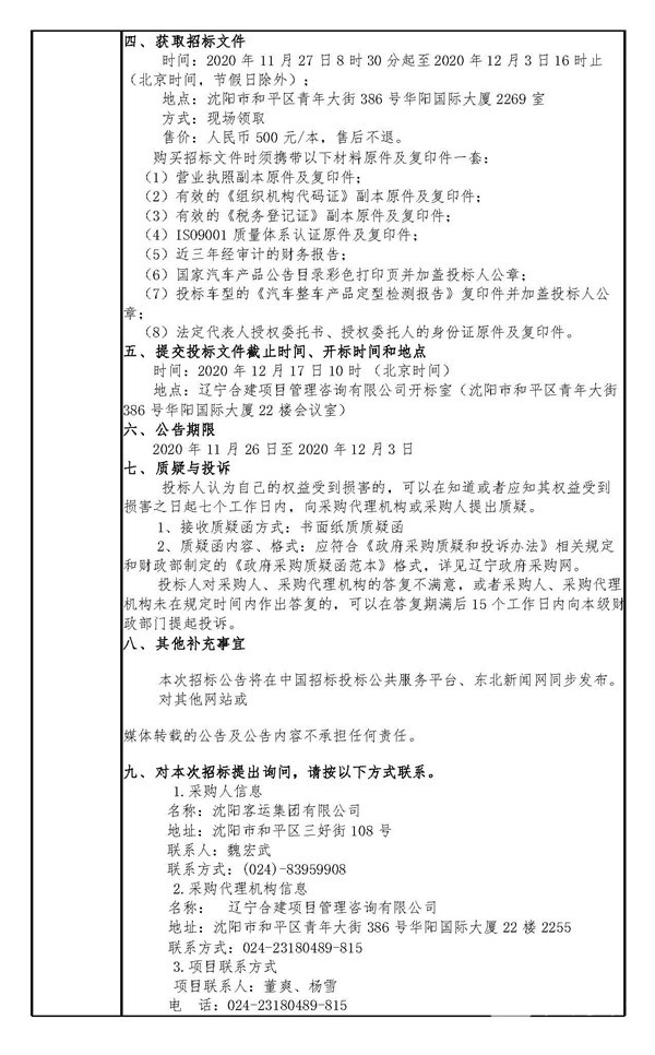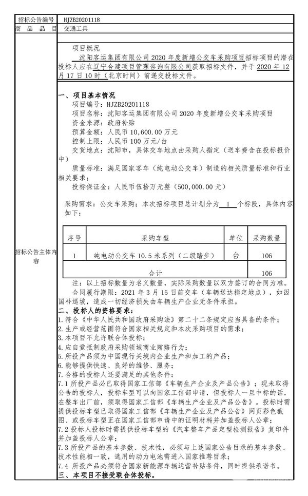 辽宁省沈阳市客运公司2020年新增106辆公交车采购项目招标公告