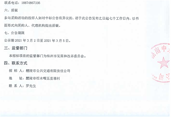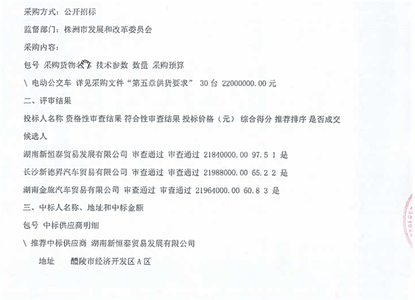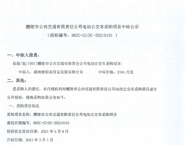 湖南省醴陵市公共交通有限责任公司电动公交车采购项目