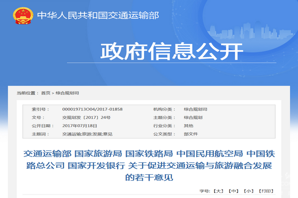 旅游业是国民经济重要的战略性支柱产业,交通运输是旅游业发展的基础支撑和先决条件。为深入贯彻落实《国务院关于促进旅游业改革发展的若干意见》(国发〔2014〕31号),进一步扩大交通运输有效供给,优化旅游业发展的基础条件,加快形成交通运输与旅游融合发展的新格局,国家交通运输部、国家旅游局等六部门于2017年07月18日联合印发出台了《关于促进交通运输与旅游融合发展的若干意见》(交规划发〔2017〕24号)。对国内交旅的融合发展提出了具体的指导意见。