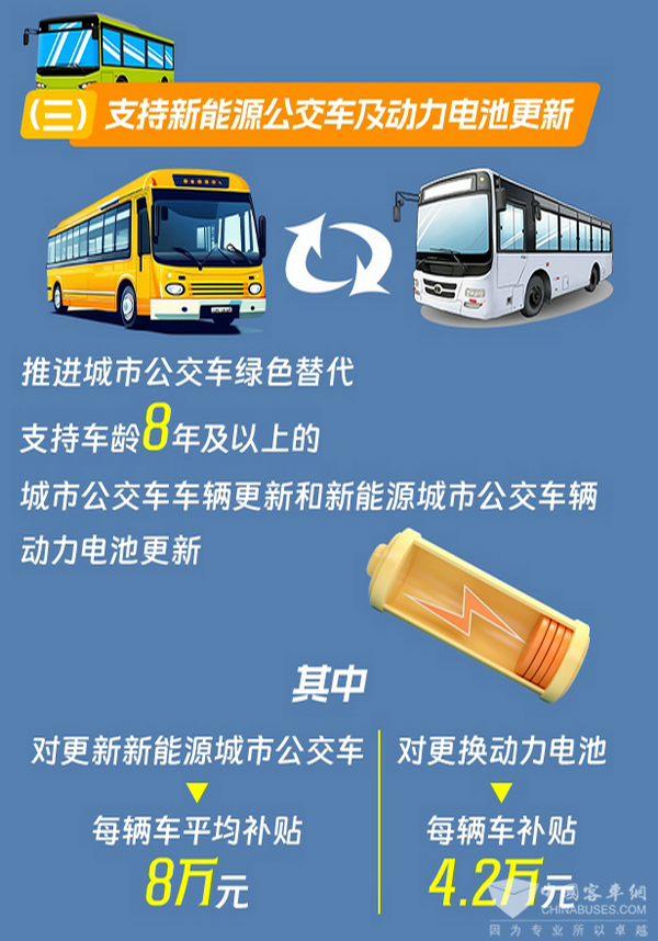 各省市下半年发布的《加力推动大规模设备更新和消费品以旧换新实施方案》中,分别将对车龄8年以上的老旧城市公交车报废且更新为新能源城市公交车的,每辆车平均补贴30万-8万元不等,对新能源城市公交车辆动力电池更换的,每辆车将补贴4.2万元不等。