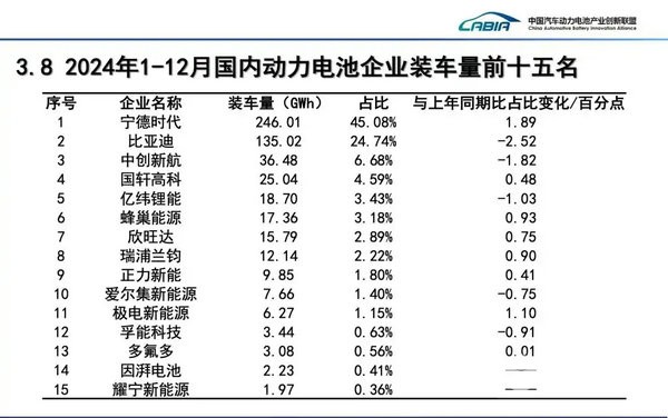 附:中国汽车动力电池产业创新联盟发布的2024年1-12月国内动力电池企业装车量前十五名名单如下: