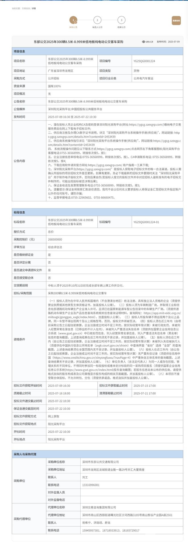 东部公交2025年300辆8.5米-8.999米低地板纯电动公交客车采购