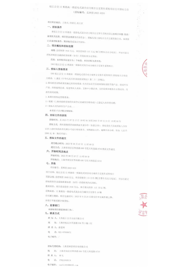 松江公交12米级高一级插电式混合动力城市公交客车采购项目:采购12米级高一级插电式混合动力城市公交客车16辆,总控制价1840万元,单价控制价115万元/辆(含整车及动力电池 )。