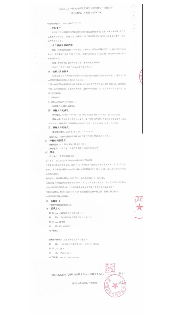 上海松江公共交通有限公司系列公交客车采购招标公告