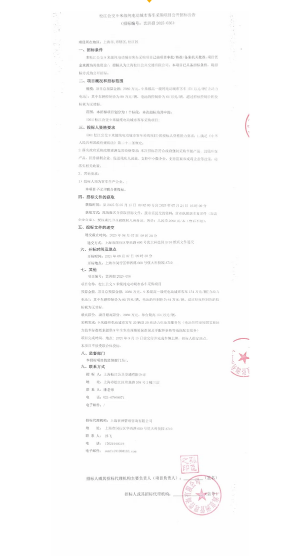 松江公交9米级纯电动城市客车采购项目:采购9米级纯电动城市客车40辆及40套动力电池及服务包,项目总预算金额6160万元,9米级高一级纯电动城市客车单价154万元/辆(含动力电池 )。