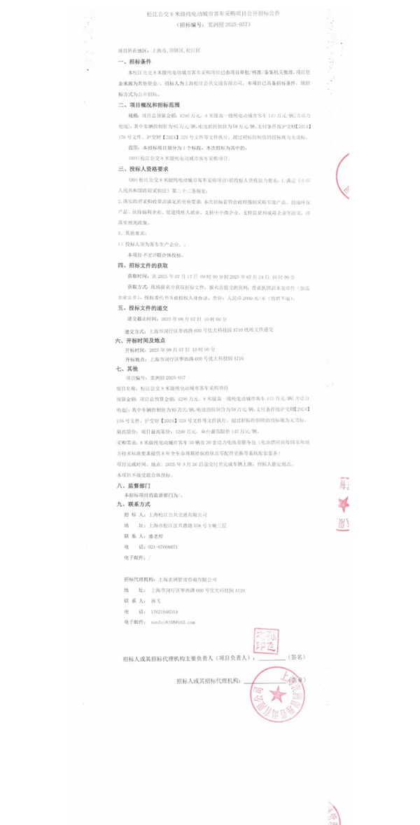 松江公交8米级纯电动城市客车采购项目:采购8米级纯电动城市客车30辆及30套动力电池及服务包,项目总预算金额4290万元,8米级高一级纯电动城市客车单价143万元/辆(含动力电池 )。