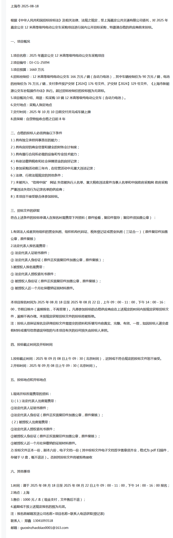 2025年嘉定公交12米高一级纯电动公交车采购项目招标公告